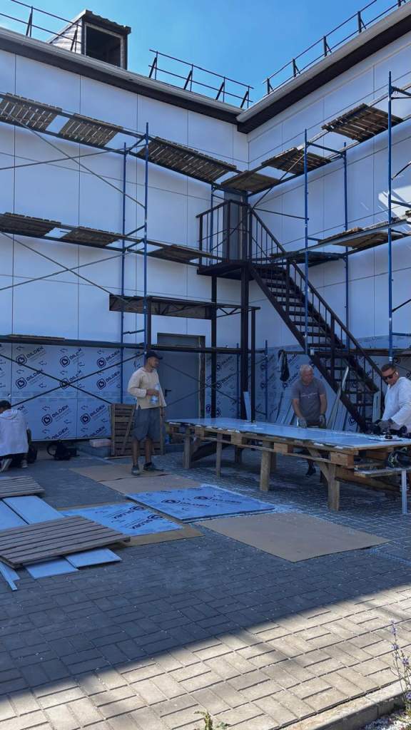 На июль сделано в ДК довольно много. Внутри здание и вовсе не узнать: новые перегородки, окна, двери. Стены внутри ДК обшивают негорючими стеновыми панелями ленплат. Это новое слово во внутренней отделке стен зданий школ, детских садов, Домов культуры, офисов и т. д.