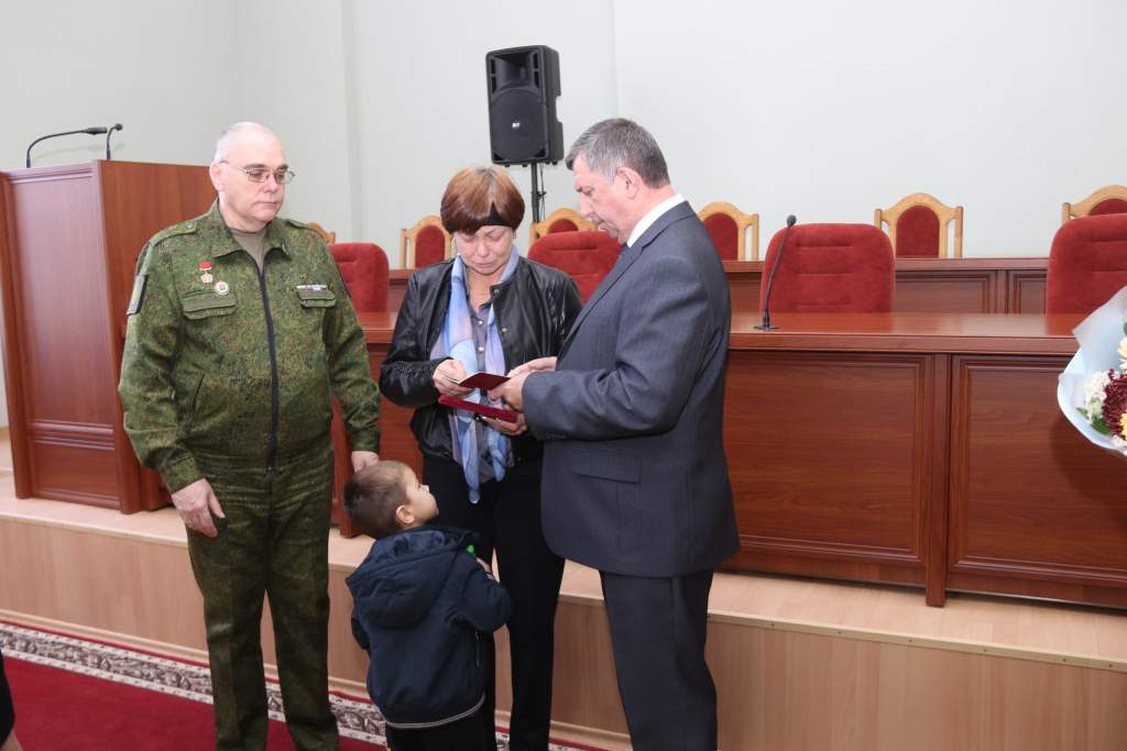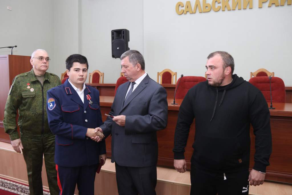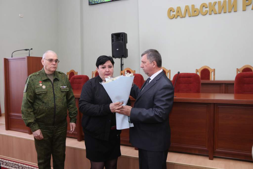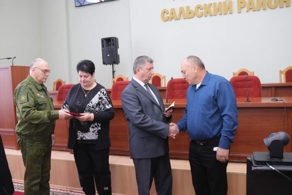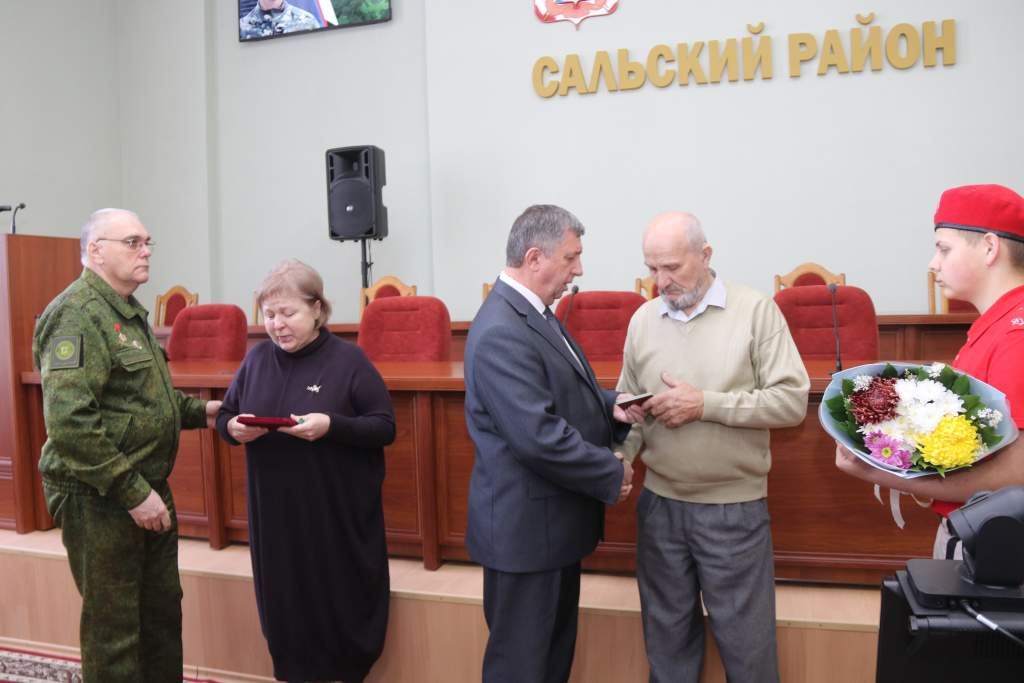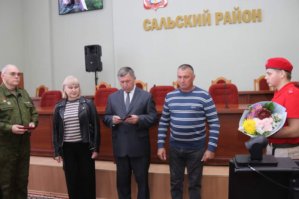 Глава Сальского района Владимир Березовский и представитель военного комиссариата Алексей Тугаенко вручили ордена Мужества родным наших бойцов – участников специальной военной операции.