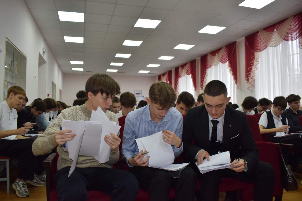 В актовом зале — более 100 учащихся десятых-одиннадцатых классов. Часть из них уже состоит на воинском учёте, а часть ещё не достигла 17-летнего возраста, когда это происходит.