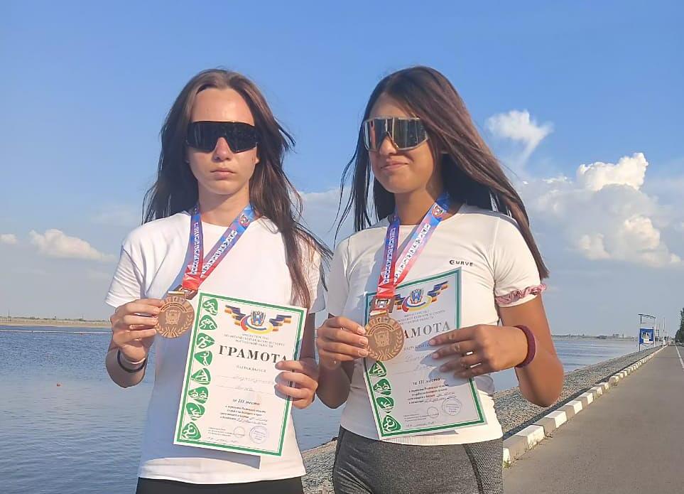 На дистанции 1000 м в байдарке-двойке Алина Решетилова и Вита Назметдинова (на фото) также стали третьими. Им же досталась «бронза» на дистанции 500 м в байдарке-двойке. Спортсмены награждены грамотами и медалями. Гребцов к соревнованиям готовила тренер-преподаватель спортивной школы Ольга Фалюшина.