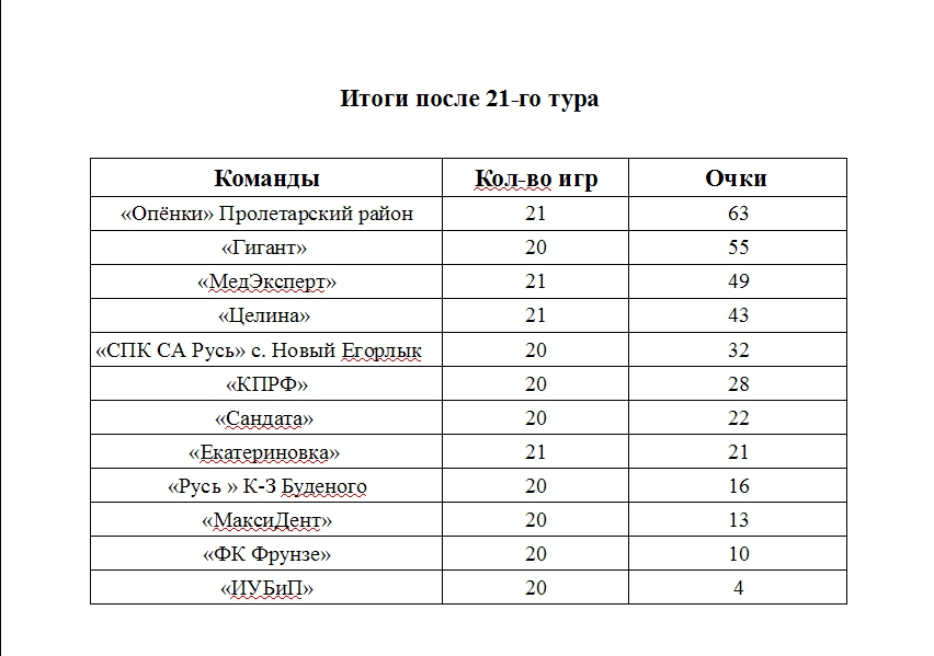 В минувшее воскресенье состоялся предпоследний, 21-й, тур чемпионата Сальского района по футболу. По итогам пяти встреч определены лидеры промежуточного рейтинга команд.