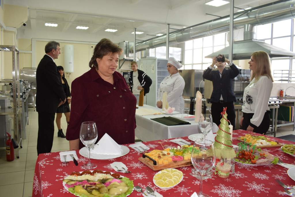 Если уже на подходе к мастерской витают запахи, от которых слюнки текут, значит, за этой дверью работают повара. Мастерская оборудована так, что не каждое кафе или столовая может похвастаться: есть промышленная мясорубка, пароконвектомат, вакуумный упаковщик. Стол уже накрыт с новогодними мотивами. «Мы сегодня предлагаем разнообразную фигурную нарезку: квадратики, брусочки, треугольники. Это не просто сырная нарезка, а «Сырное царство». Тут и мёд, и разнообразные орешки, семена. Здесь же представлены соленья. Мы постарались, чтобы они были не только вкусными, но и отличались разнообразной цветовой гаммой, выглядели красочно. В мясной нарезке — несколько видов колбасных изделий», — рассказывают преподаватель профессиональных дисциплин Юлия Педченко, мастер производственного обучения Анна Бондаренко и студентка Арина Волкова.